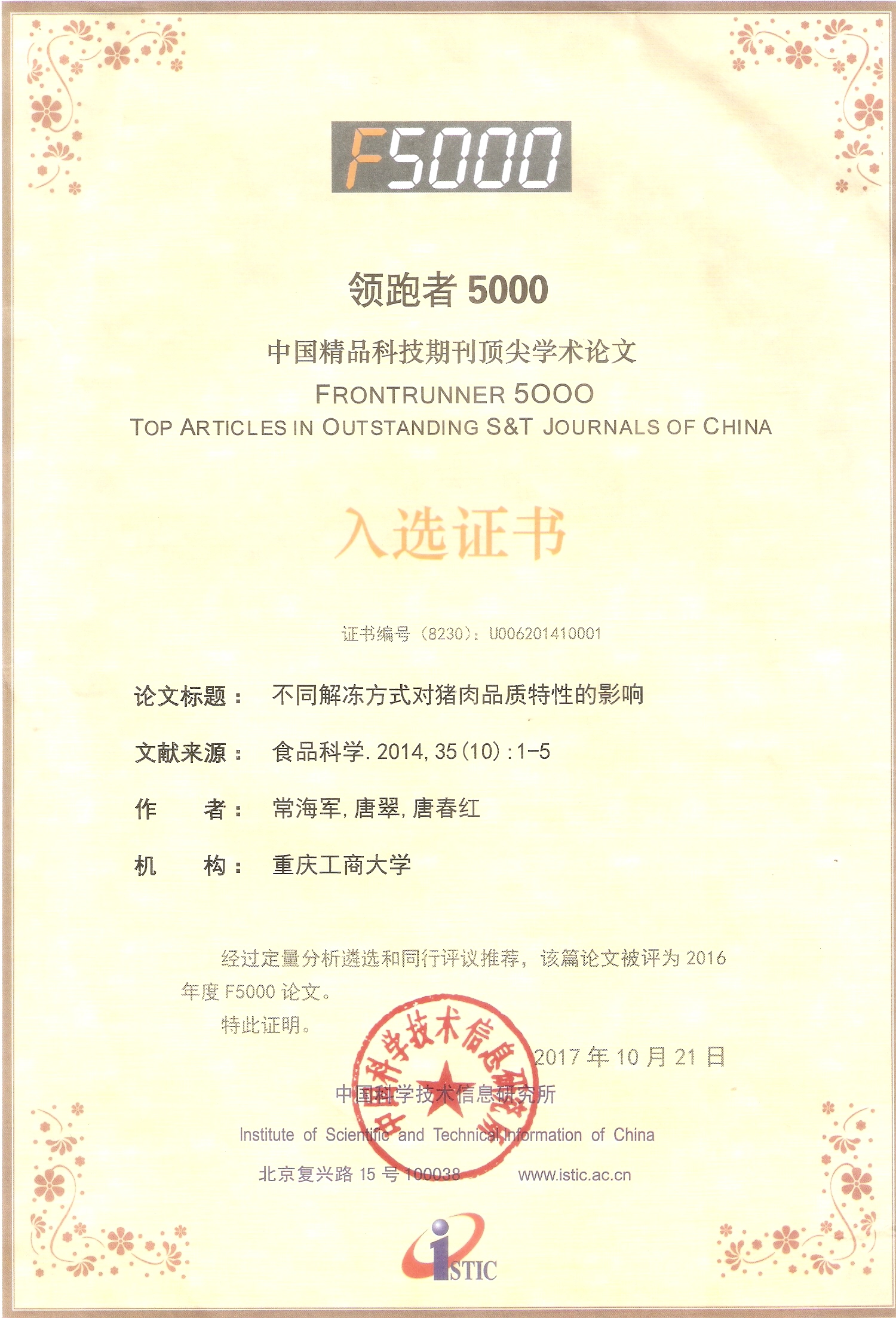 近日,公司太阳成集团tyc234cc常海军等老师撰写发表在《食品科学》题为“不同解冻方式对猪肉品质特性的影响”论文入选 “领跑者5000-中国精品科技期刊顶尖学术论文”,并获得入选证书。