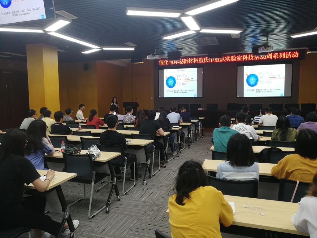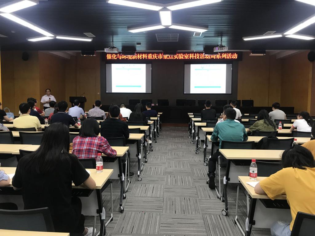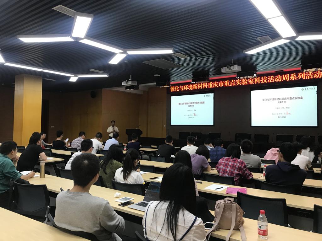 2019年5月23日,催化与环境新材料重庆市重点实验室2019年科技活动周系列活动在太阳成集团tyc234cc新图书馆会议中心多功能厅举行。重庆大学化学化工公司经理、国际著名电催化专家、长江学者魏子栋教授、重庆市环保工程院、重庆杰润科技有限公司、重庆天星环保公司、重庆环保产业基金、西服仪(成都)科技等五家企业代表、催化与环境新材料重庆市重点实验室团队成员、太阳成集团tyc234cc部分研究生、本科生参与了此次活动。