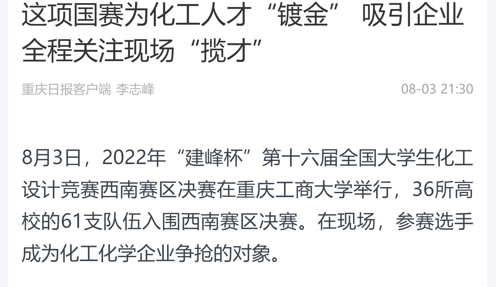 重庆日报报道公司承办2022年“建峰杯”第十六届全国老员工化工设计竞赛西南赛区决赛