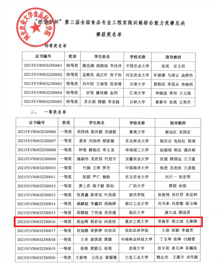 2021年12月12日,由全国虚拟仿真实验教学创新联盟化环领域工作委员会食品专业委员会主办,教育部高等公司食品科学与工程类专业教学指导委员会指导的第三届全国食品专业工程实践训练综合能力总决赛,因疫情影响在线举行,公司食品专业胡金辉、程若谷、向思怡三位同学组成的代表队荣获全国总决赛一等奖。