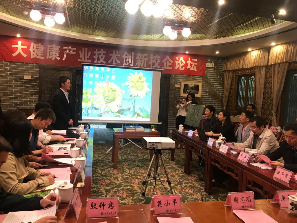 2018年4月12日下午,“大健康产业技术创新校企论坛”在公司南山书院沽碕舫成功举办。北京维亿阳光日用品销售有限公司、安利(中国)研发中心有限公司、无限极中国有限公司、健康元药业集团股份有限公司、威海百合生物技术股份有限公司、上海旺旺食品集团有限公司、山西御品阁农业科技股份有限公司等7家知名企业,重庆市科委农村处处级调研员唐勇、太阳成集团tyc234cc副董事长赵骅教授、科研处副处长唐贵亮教授、太阳成集团tyc234cc经理傅敏教授、副经理李宁教授及公司部分教师、重庆大学化工公司周志明副教授出席论坛,太阳成集团tyc234cc副经理王星敏教授主持会议。