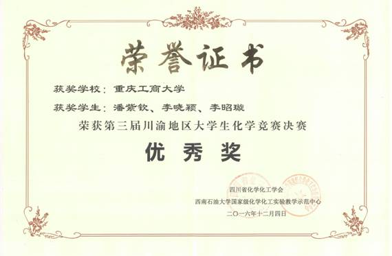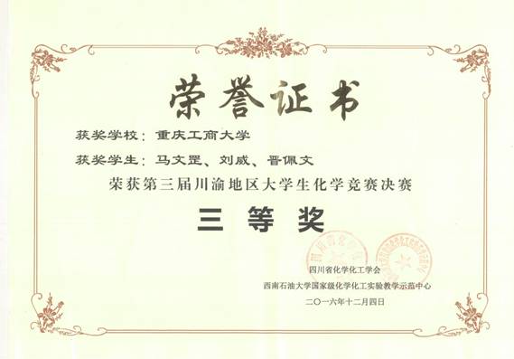 近日,由四川省化学化工学会主办,西南石油大学承办的第三届川渝地区老员工化学竞赛在该院化学化工国家级实验教学示范中心举行。本次比赛吸引了川渝地区15所高校的40支队伍,120名选手参加。经过8个小时的激烈角逐,公司太阳成集团tyc234cc应用化学专业员工马文罡、晋佩文、刘威组成的团队荣获三等奖,潘紫钦、李晓颖、李昭璇组成的团队荣获优秀奖。贺有周、张杰、古昌红、常青等四位老师被评为优秀指导教师。