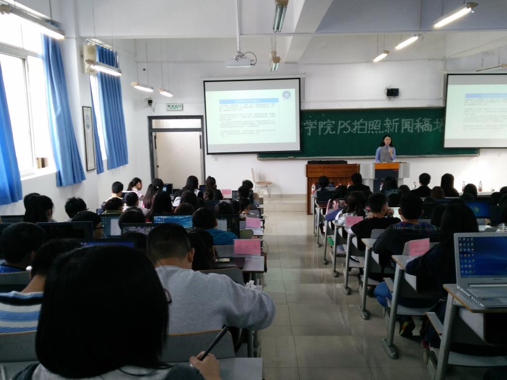 下午两点三十分,活动准时开始了。首先是新闻稿培训课程,由文新公司部长何金晏主讲,何部长从新闻的生产流程入手,将新闻稿的种类进行了细致的分类,并向同学们一一介绍各类新闻稿的格式、要求和方法,摘录了许多优秀范例供我们欣赏,让在场的干事们纷纷称扬。第二部分是由文学与新闻公司的主席游飞燕带来的PS培训,同学们纷纷拿出电脑跟着游主席手把手教学,将听到看到的知识用于实践,让同学们对PS有更加深入的认识和了解,其效果果然不同于以往。最后压轴的是文新公司分管主席蒋力力主讲的拍照、摄影培训,蒋主席用其生动有趣的讲解让到场人员听得津津有味,为同学们介绍了市场上最普及的两个品牌的单反,以此为据为同学们分别比较了它们各自的优缺点以及其具体操作步骤。台下的干事们也纷纷表示:“蒋主席教授的摄影方法和拍照技巧简直是为我们这些新干事们指点了迷津。”