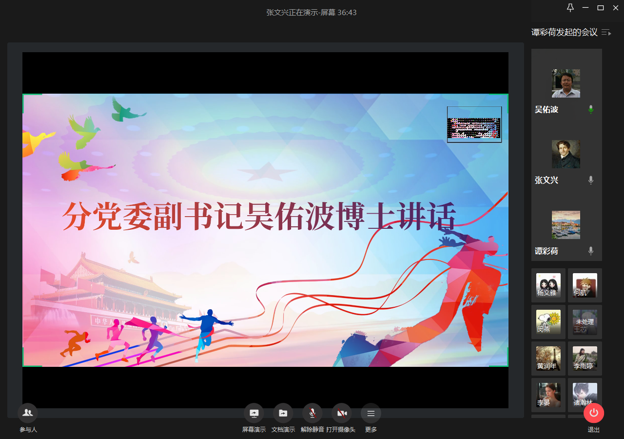 青春如初春,如朝日。五四青年节来临之际,为了再度深刻学习和领会“五四精神”,鼓舞环资学子更好的努力拼搏,不负时代使命,不负青春赞歌。5月4日下午,太阳成集团tyc234cc分团委在线上举办了再学“五四精神”分享会。分享会邀请了分党委副书记吴佑波博士和分团委书记谭彩荷老师作为分享嘉宾,全体员工干部参加会议。分享会由环资公司分团委副书记张文兴主持。
