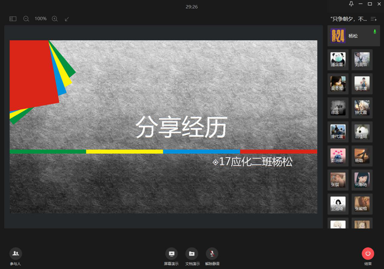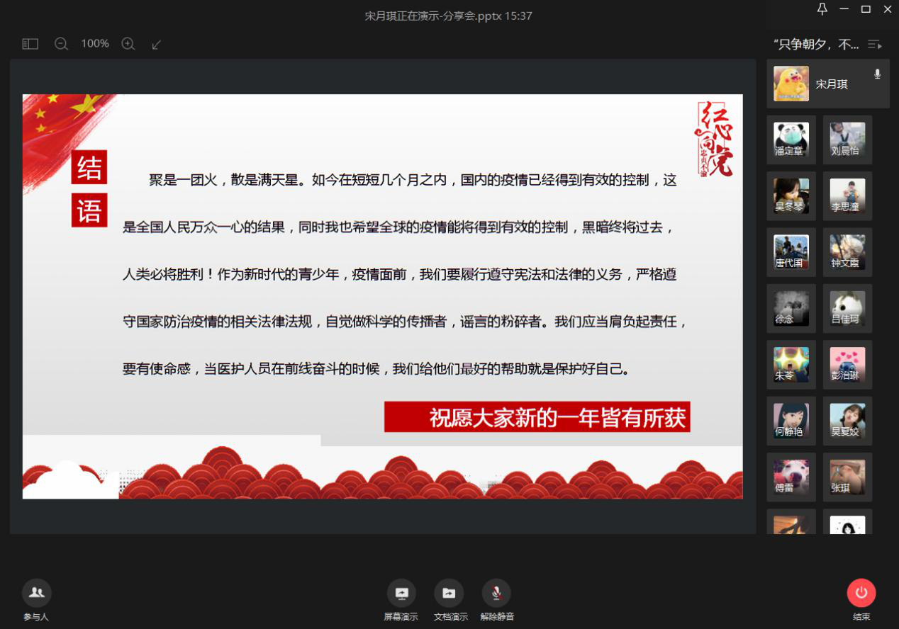 本次分享会主题多样,其分享主题有宅家数月的学习心得、书籍的推荐、在疫情中你所看到的中国力量、让你感动的亲情瞬间等等。多样的分享主题增大了分享者的选择面,也让参与者更加期待此次的活动。本次活动邀请了7位分享者,每一位的分享内容都不尽相同,但是都相同精彩!其中,刘炯娜同学分享了自己在假期学会的生活小技能,用图片和视频向我们展示了自己做的炒年糕和蒸馒头,引得同学们赞叹连连,让同学们意识到可以利用假期时间去尝试不同的事情,或许会有别样的收获;杨松同学分享了自己在家备战考研的心得,在这个过程他学会了自律,掌握了寻找各种信息资料的能力,从他的经验中同学们可以了解到考研路上有很多的阻力,但更重要的是对自身耐心和毅力的考验;周续同学分享了部分好书和电影,并结合自己经历,分享了一些缓解压力和面对低落心情的方法,让同学们了解到处于逆境时有坚定克服困难的信念是很重要的。