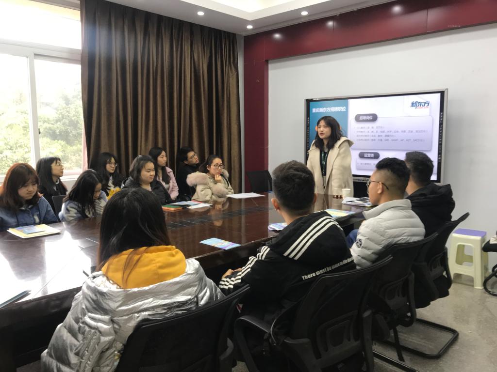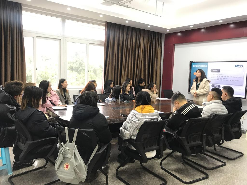2019年3月4日下午,重庆新东方培训公司来到公司宣讲并选聘优秀毕业生。公司宣讲会与面试分别在90609会议室、90425教室进行。公司党委书记王竹青、毕业班辅导员、重庆新东方培训公司罗经理等公司代表出席了宣讲会,往届优秀毕业生刘富磊作为面试考官参加了此次招聘会。