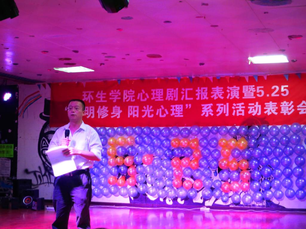 2014年5月25日晚7点,环生公司心理剧汇报表演暨5•25“文明修身 阳光心理”系列活动表彰会在菊园二楼活动中心圆满落幕。员工处副处长潘焱、公司党总支王竹青书记、公司党总支宋海雨副书记、员工处心理健康教育与咨询中心胡佳怡老师以及环生公司所有辅导员出席本次活动。