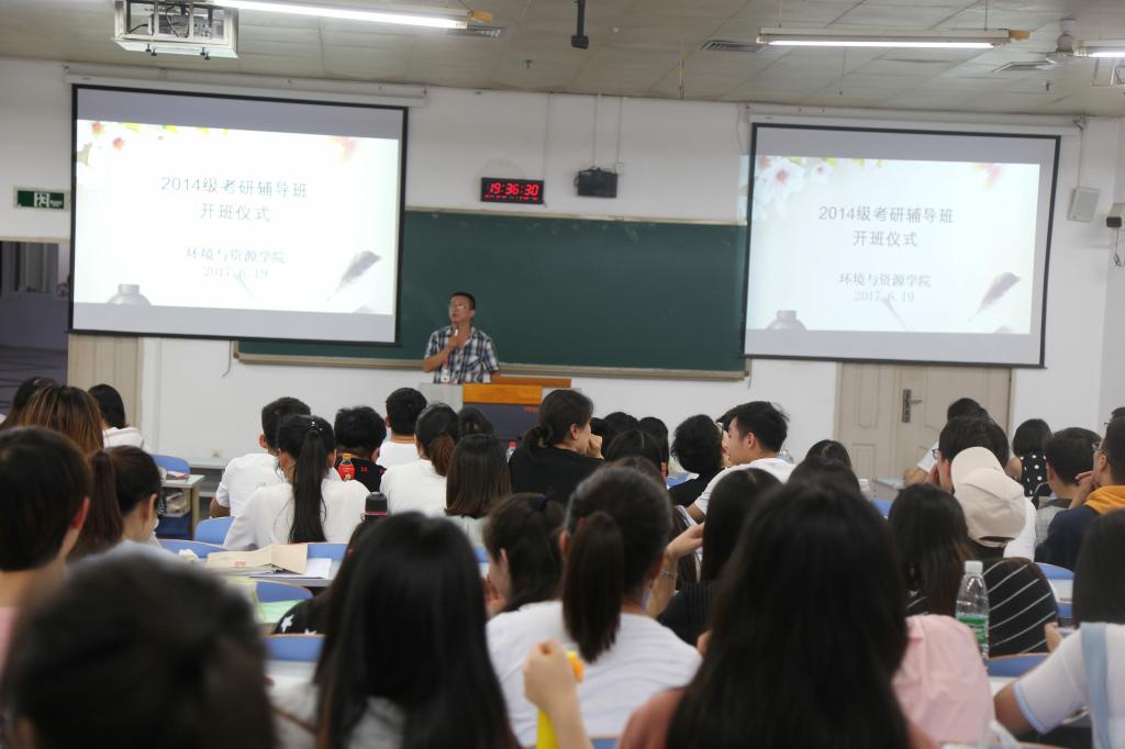 6月19日晚上7点,太阳成集团tyc234cc2014级考研辅导班开班仪式在慧智楼90208成功举办。太阳成集团tyc234cc分党委王竹青书记、经理傅敏教授、副经理李宁教授、副经理王星敏教授、全体辅导员及2014级考研同学参加本次开班仪式。开班仪式由学团办主任谭彩荷主持。