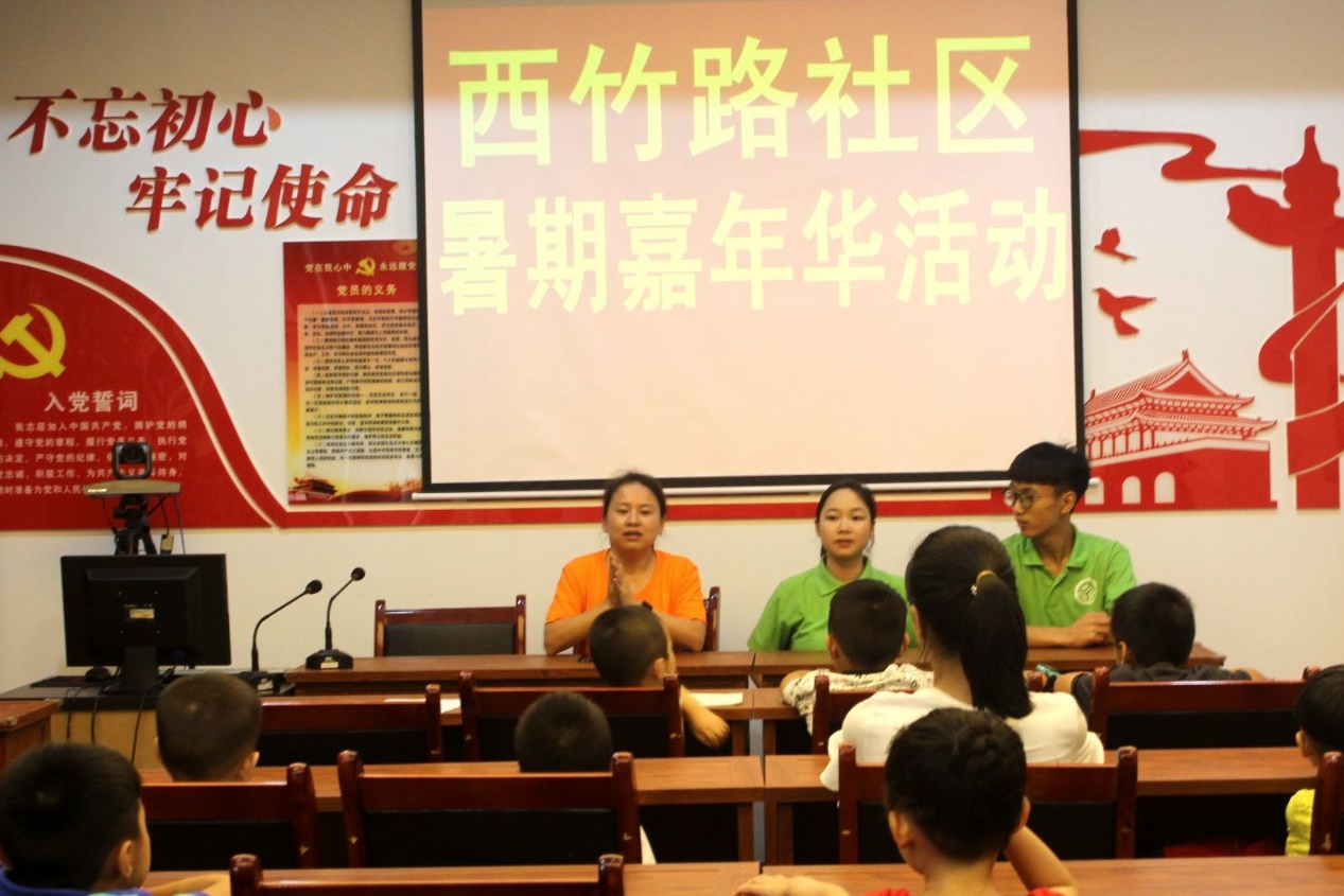 上午9点30分,西竹社区便民服务中心廖淋淋书记及志愿者为到场参加暑期嘉年华的小朋友进行了简单的开班典礼;在开班典礼之后“美丽中国课堂一:文艺舞蹈课”便拉开了序幕,在缓缓响起的悦耳歌声笼罩下,小朋友们也随志愿者翩翩起舞;美丽中国课堂旨在从文化艺术等方面帮助该社区儿童度过一个健康快乐而又充实的暑假,与此同时带给他们来自社会大众的关爱。下午,志愿者们去到了西竹社区的各个街道,通过分发给当地居民由九龙坡区环保局下发的环保宣传单、环保宣传册及环保宣传袋来增强居民的环保意识。