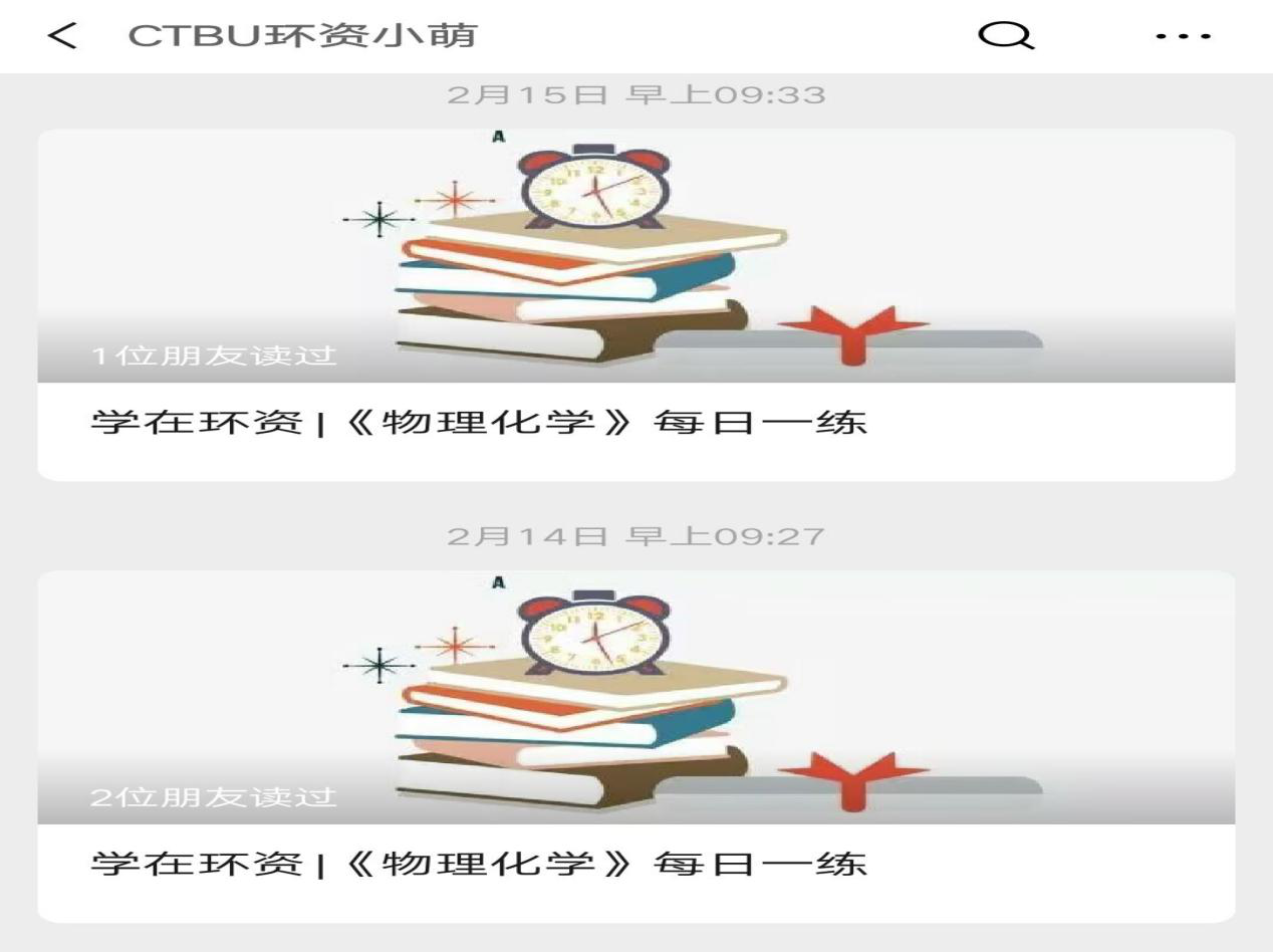 2020年2月5日起“环资公司学习提升群”为大二的同学提供《物理化学》每日一练题目进行练习以及《物理化学》复习题及答案进行查漏补缺,除此之外还邀请授课老师和三名成绩优异的同学在群内为同学们进行答疑;2020年2月16日起,“环资公司2017级考研同行群”则为大三的同学提供《考研英语》每日一练的英语长难句解析内容和往年真题来为考研打好坚实的基础。