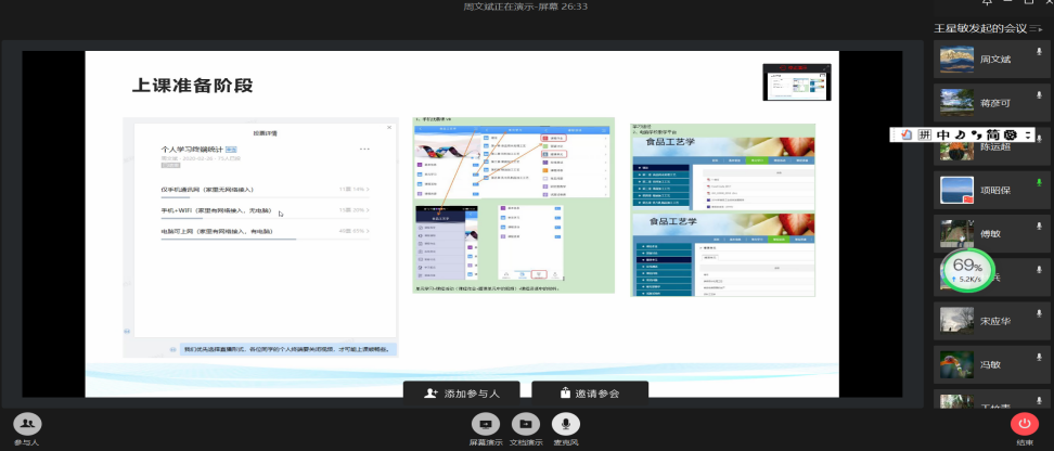 会上,王竹青书记强调了在线教学的重要性和员工管理的必要性。傅敏经理以身示教,以《结构化学》课程授课为例,风趣地介绍了在线教学经验,并面向教师提出保障在线教学质量的要求。院督导周文斌老师梳理《食品工艺学》“课前准备、课中互动、课后检查”等授课环节遇到的问题,以PPT形式呈现了开课一周的教学心得及解决问题的方法。杨海林博士分享了解决“在线黑板”的Pointofix软件使用、员工在线学习状态评价监控,并结合《环境系统工程》分享巧用“企业微信平台”的6个技巧。张杰博士分享了《大学化学》在线教学保障教材的3种途径;宋应华教授分享《化学反应工程》的员工打卡管理的做法;吴虹博士分享《环境监测与分析》课程中拉近师生距离的在线教学互动;吴四维老师结合《仪器分析》,解惑老师们利用在线综合平台使用题库等问题;吴佑波副书记介绍了员工管理工作。此外,项昭保教授、唐春红教授、韦晓兰教授、魏星耀教授、屠大伟教授、张会均博士、陈刚博士、方玲博士以及校督导幸宏伟老师、院督导陈盛明老师、王瑞琪老师等六个专业的18位老师先后分享了线教学开课心得,解惑问题,并围绕“如何把控员工在线学习状态、如何保障在线教学质量”开展了积极的讨论,谏言纳策。