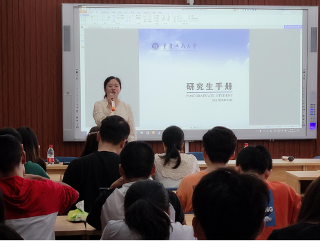 谭彩荷副书记从研究生手册、奖学金评定、学会做人等三个方面,详细讲解了研究生日常管理等事宜,希望同学们学有所获,提前做好职业规划,成为最优秀的自己。