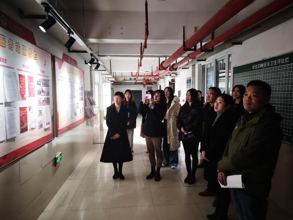 2021年12月20日,重庆市教委文明楼栋评审组专家莅临公司新北23栋宿舍区例行文明楼栋评选工作,太阳成集团tyc234cc谭彩荷副书记、学团办辅导员老师以及楼管会及党员服务站干部同学陪同检查。