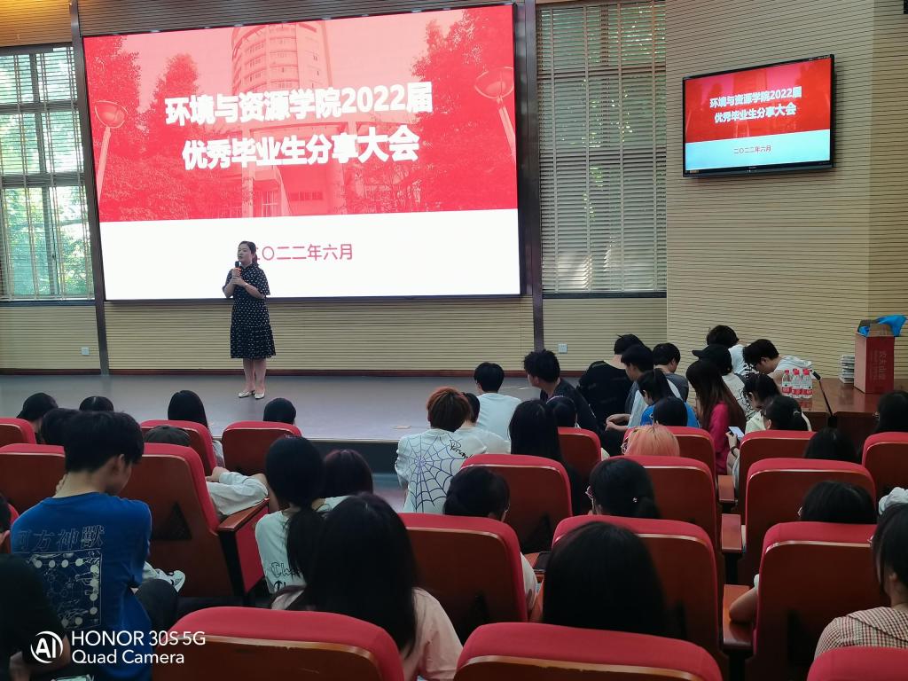 6月21日上午,公司在兰花湖学术报告厅召开2022届优秀毕业生分享会暨考研表彰大会。公司邀请到了2018级应化专业黄华裕、食品专业吕媛源和环境专业的吴夏姣等优秀毕业生代表为2021级的全体同学们分享自己的老员工活、考研经历。分享会由公司副书记谭彩荷主持。