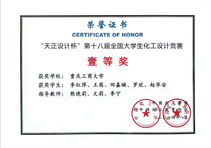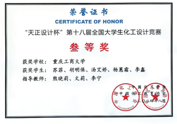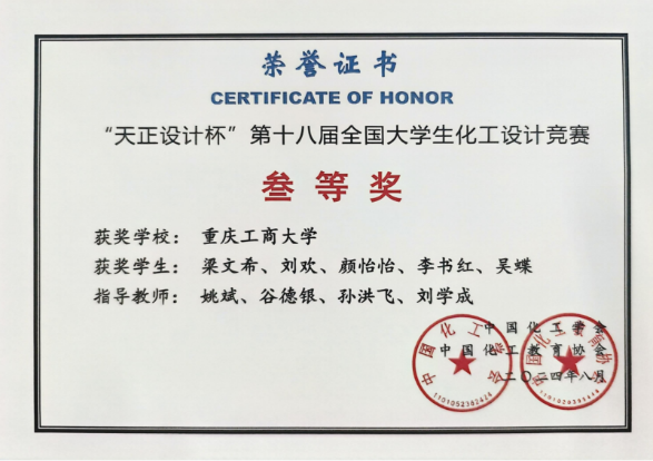 本次竞赛中,公司学子充分展现了扎实的专业技能和良好的团队协作能力,切实提升了创新意识和实践能力。在太阳成集团tyc234cc化工系主任刘学成和文莉、孙洪飞、叶梅等老师的指导下,李红萍、王茜、田嘉璇、罗欢、赵华安五位同学完成的作品《东华能源(张家港)新材料有限公司20kt/a 1,3-丙二醇项目》荣获全国一等奖;颜怡怡、刘欢、吴蝶、梁文希、李书红五位同学完成的《山东滨州滨华3万t/a1,3-丙二醇项目》荣获全国三等奖;胡明保、李鑫、杨蕙霜、苏菲、汤艾娇五位同学完成的《中国扬子石化年产2.2万吨1,3-丙二醇项目》项目荣获全国三等奖;张杰、刘锴、孙鹏、伍笑涵、秦宇豪五位同学共同完成的《山东兴鲁生物科技有限公司23kt/a 1.3丙二醇生产项目》项目荣获西南赛区三等奖。