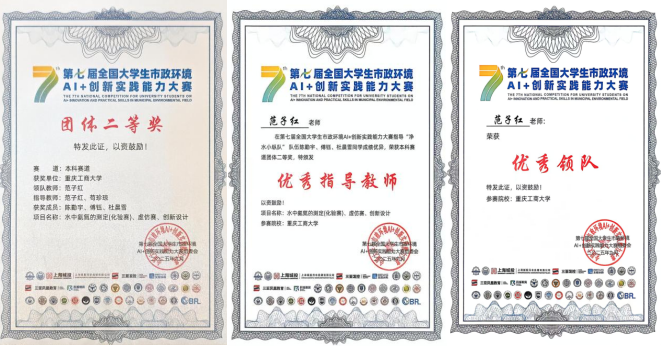 在本次高规格的全国性赛事中,公司本科生团队“净水小纵队”凭借扎实的专业功底和创新实践成果脱颖而出。团队成员陈勤宇、傅钰、杜晨雪在范子红、苟珍琼两位老师的悉心指导下,先后通过检测(化验赛)、虚拟仿真(虚仿赛)以及 AI 与工程设计(创新设计)三轮严格筛选,最终在总决赛中荣获团体二等奖”;范子红、苟珍琼两位老师获评“优秀指导教师”,范子红老师获评“优秀领队”。