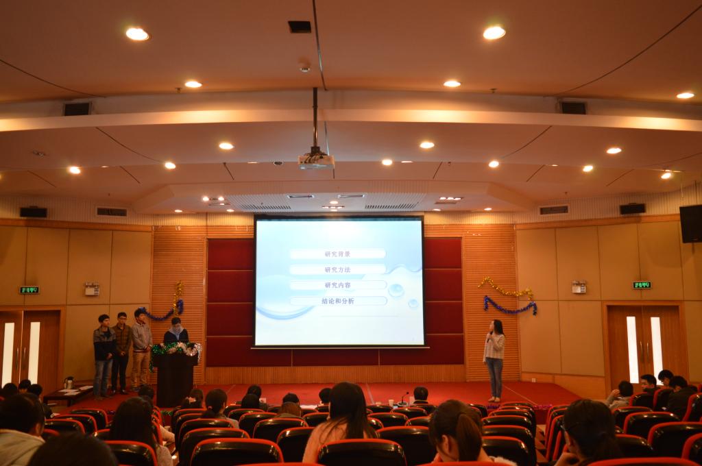 这次“挑战杯”院内赛共有十五支队伍参赛,每队由一名主讲人以PPT的形式汇报展示作品要略,时间不超过五分钟。设有答辩环节,回答评委提问不超过五分钟。随后,专家按照评分标准给每支参赛队伍评分,决出优秀队伍。比赛开始后,每支参赛队伍都以最良好的状态,简明扼要的介绍了自己作品的研究方法、用途、优劣及其前景发展。有的队伍还拿出了自己创意的前期成品,详细展示了自己的科研成果。比赛如火如荼的进行着,在答辩环节,各位评委的提问犀利却又不乏幽默,旨在使参赛选手明白其科研作品的优劣及其可提升空间。评委们还从其参赛作品的市场前景、实用性、必要性、对人体健康的影响等方面提出建议,悉心的指导了参赛选手。比赛节奏张弛有度,现场充满了浓厚而和谐的学术讨论气氛。