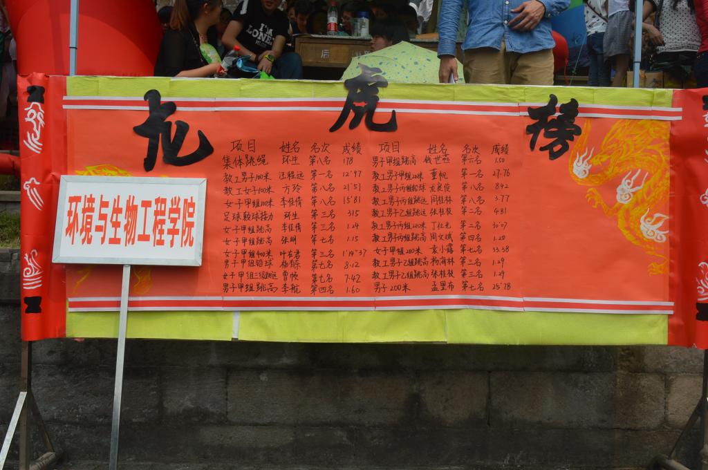 经过两天的激烈角逐,环生健儿们以高昂的意志,执着的拼搏赢得了以下殊荣:李佳倩荣获女子甲组跳高第三名,女子甲组100米第八名的双丰收;叶在君荣获女子甲组400米第三名;李航荣获男子甲组跳高第四名;钱世燕荣获男子甲组跳高第六名;张明荣获女子甲组跳高第七名;杨有东荣获男子甲组铅球第七名;曾帧荣获女子甲组三级跳第七名。