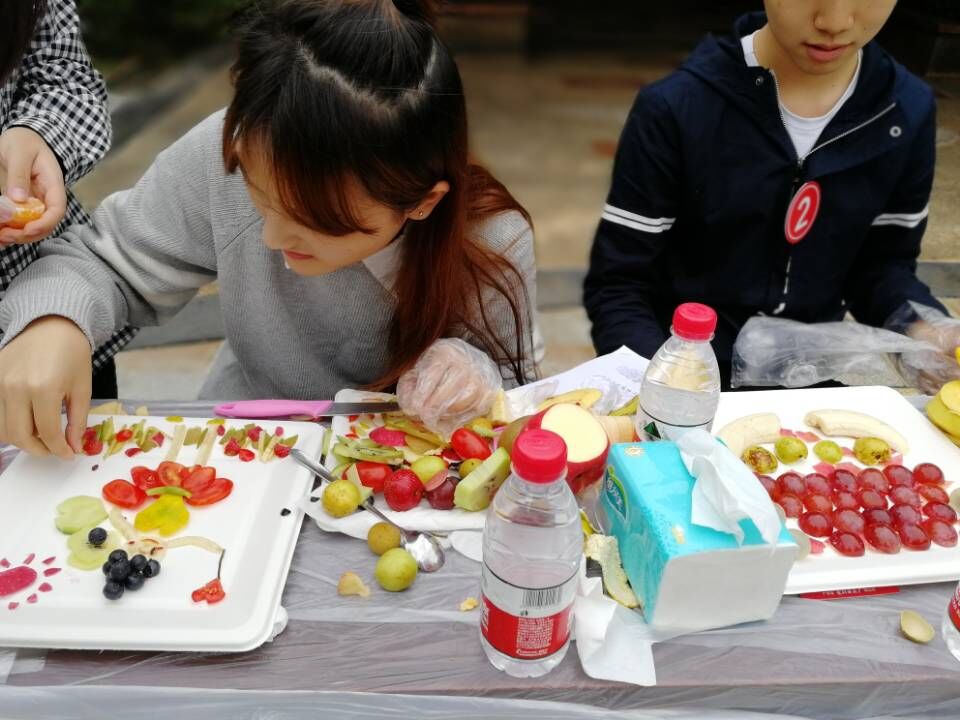活动伊始,食协会长夏宏盛首先向大家介绍了食协组织和举办本次活动的目的。随后,十支参赛队伍在主持人的带领下,针对各类水果的营养价值知识展开了激烈的抢答,活跃了现场气氛。紧接着,所有队伍选取了制作水果拼盘的材料并进行创作。各小组一边细心地切着水果雕刻,一边对创作发表各自的意见,使整场活动在欢笑声中有条不紊地进行着。最后,十支队伍都做出了让自己满意的作品,并为自己的作品作了绘声绘色的讲解。经过现场评分,Hello队作品《开心小喵》获得了第一名,王洪队作品《刺猬沙滩,晚安》和Tommy队作品《夏威夷》分别获得二等奖和三等奖。