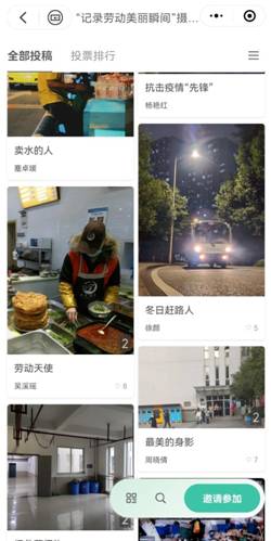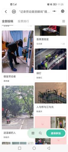 在活动前期,楼管会分别在宣传栏和qq群进行积极宣传,近30名同学参与了本次活动。同学们踊跃上交了摄影作品,有校园交通车驾驶老师的身影,也有为同学和老师们辛勤劳动的食堂大厨,也有夜以继日管理公寓的楼栋宿管员,还有为校园默默付出的清洁阿姨。本次活动以线上投票的形式开展最美劳动瞬间摄影照片的评选,经过四天地激烈角逐,评选出了本次活动11份优秀摄影作品。