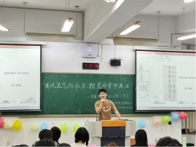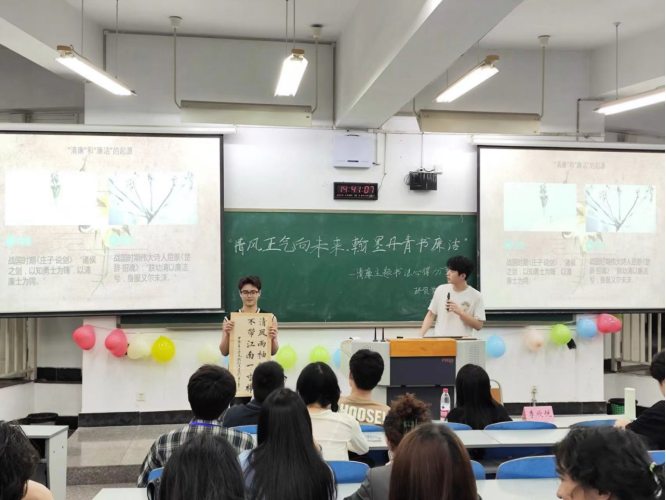 本次活动宣传共收集作品88份。活动采取了线上大众投票以及线下现场投票两种形式,经过激烈的角逐,最终六名同学的作品脱颖而出,其中梁瑞雪同学荣获一等奖;祝彬淏、刘莹同学荣获二等奖;袁倩、潘茂香、黄陈曦同学荣获三等奖。同学们的作品字精而传神,一笔一划都遒劲有力诗意流淌,字里行间蕴含丰富的情感,深刻契合了活动主题,沁人心脾。4月19日,获奖者受邀来到活动现场分享他们创作的初衷和对“清廉”的理解。梁瑞雪同学分享了她的感悟:“清廉”是恪守清贫的两袖清风,是青竹亮节的宽广胸怀,是“富贵不能淫”的洁然正气,是“贫贱不能移”的铁骨铮铮。祝彬淏和刘莹同学在分享中提及“两袖清风”一词,巧妙呼应主题的同时也启示同学们深度领悟“清廉”一词。同学们与笔共舞、用笔绘美,用挥毫泼墨的方式引导同学们在笔尖上寻找“清廉”。 三位嘉宾老师对本次活动进行了总结,鼓励同学们积极学习书法,在习得一手好字的同时提升思想道德修养,真正做到“清风正气向未来,翰墨丹青书廉洁”。