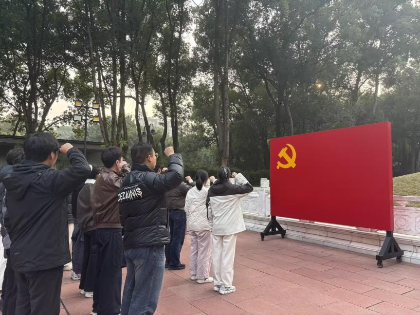 参观结束后,全体师生来到歌乐山烈士墓园,研究生第一党支部支部书记胡诗越带领党员们重温入党誓词,全体党员面向鲜红党旗、高举右手、神情庄重,铿锵有力的誓言在陵园回荡,既表达了对革命先烈们最崇高的悼念与敬意,也彰显了环资学子坚守初心、砥砺奋进的坚定信念。