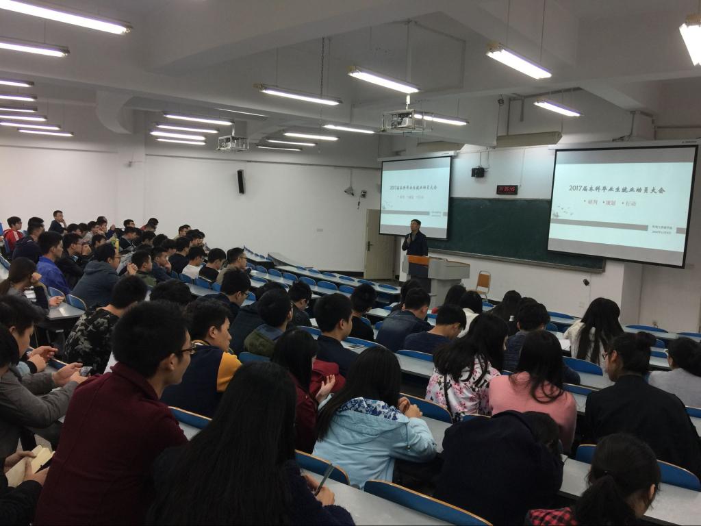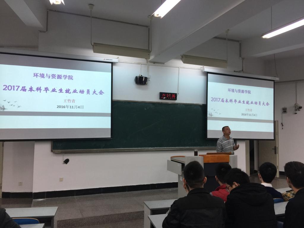 2016年11月4日下午2:30,环境与资源学院2017届本科毕业生就业动员大会在90326顺利召开。大会由环资公司党总支王竹青书记主讲,环资公司傅敏经理、就业联络员秦爽、毕业班辅导员卢鹏和边凤霞老师出席了此次大会,2017届大部分员工参加了此次动员大会。