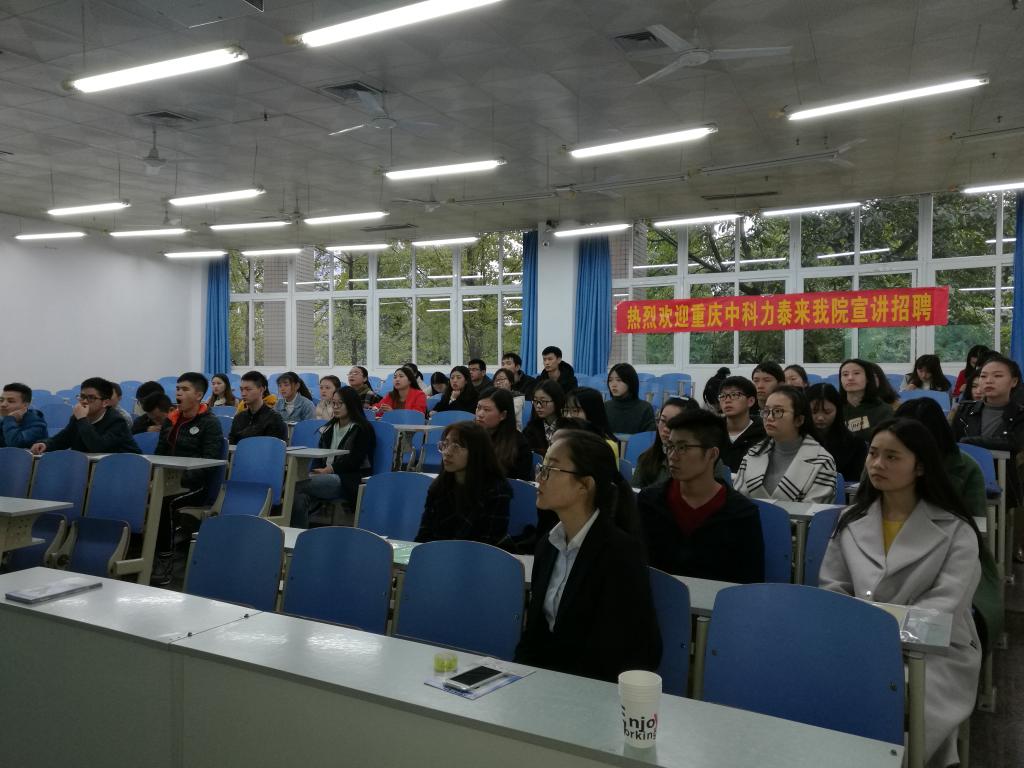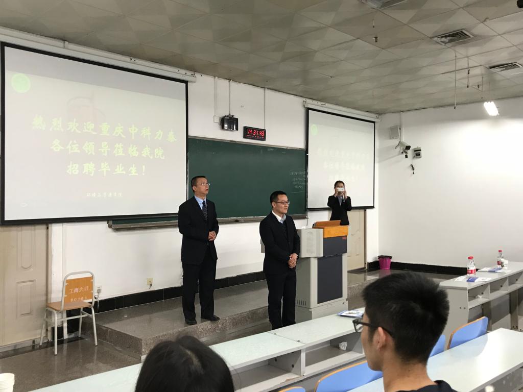 11月21日下午,重庆中科力泰高分子材料股份有限公司专场招聘会在90209顺利举行。公司分党委王竹青书记、中科力泰人力资源部高翔部长、人事专员张宪女士等出席了此次招聘会。