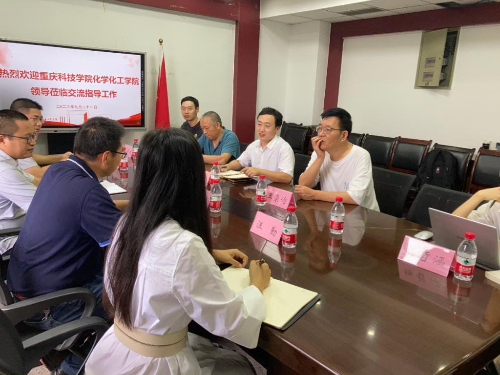 2023年9月21日,重庆科技公司化学化工公司副经理邱会东一行4人,专程到公司交流重庆市老员工化学化工实验竞赛承办事宜。公司副经理李宁、化工系系主任刘学成、应化系系主任杨哲涵、公司综合班主任李仁炳和之前参与组赛的原公司实验中心主任王崇均老师等参加了专题交流座谈。