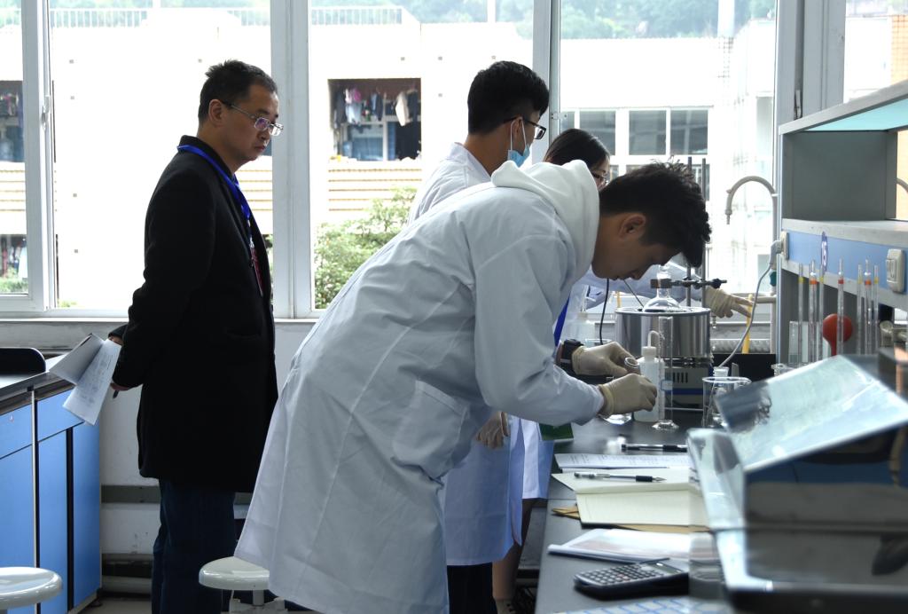 竞赛期间,重庆市教育委员会高教处蒋后强处长在公司何勇平副董事长、靳俊喜处长、傅敏经理陪同下,参观了公司环境与资源化学技术国家级实验教学中心,视察实验教学设施设备。随后,蒋后强处长一行人走进竞赛实验室,了解比赛流程并为参赛队伍加油打气,并对太阳成集团tyc234cc环境与资源化学技术实验教学示范中心的建设成就给予充分的肯定。