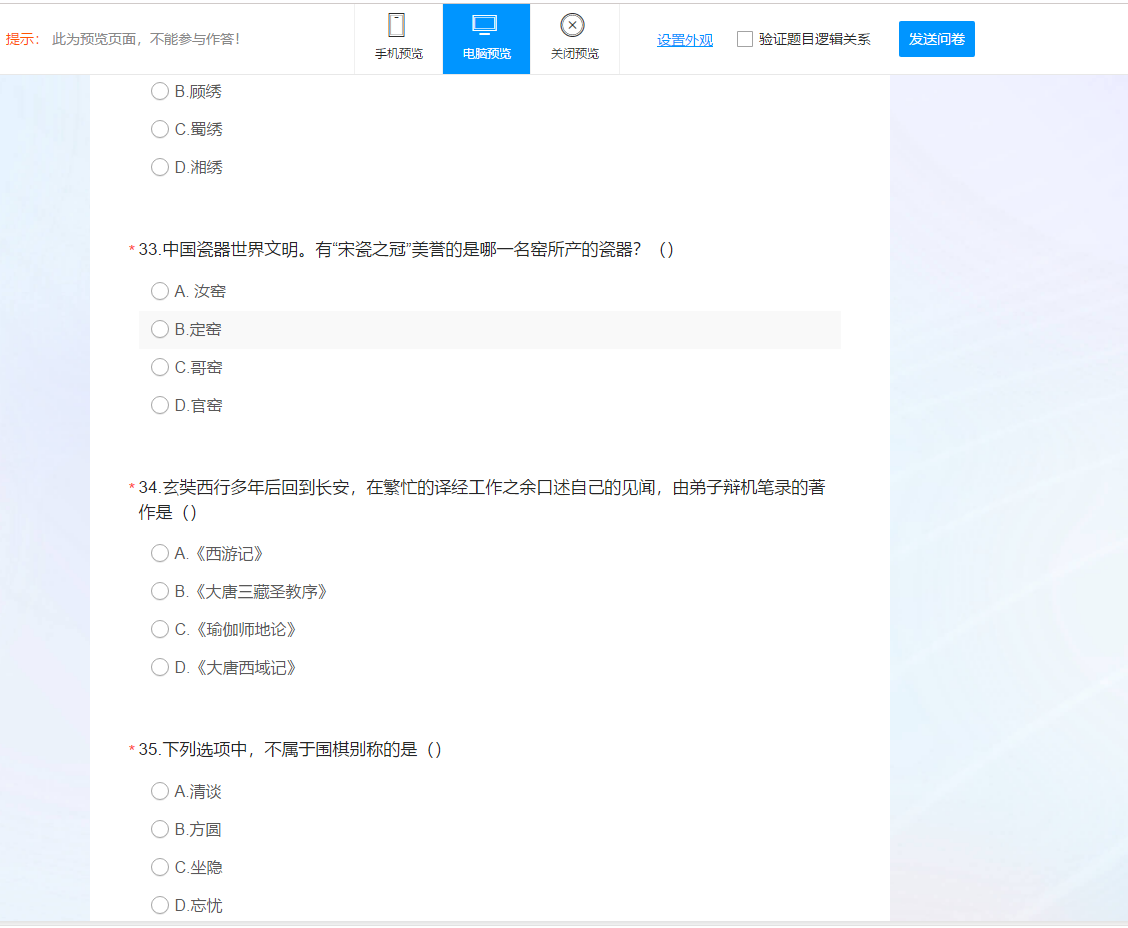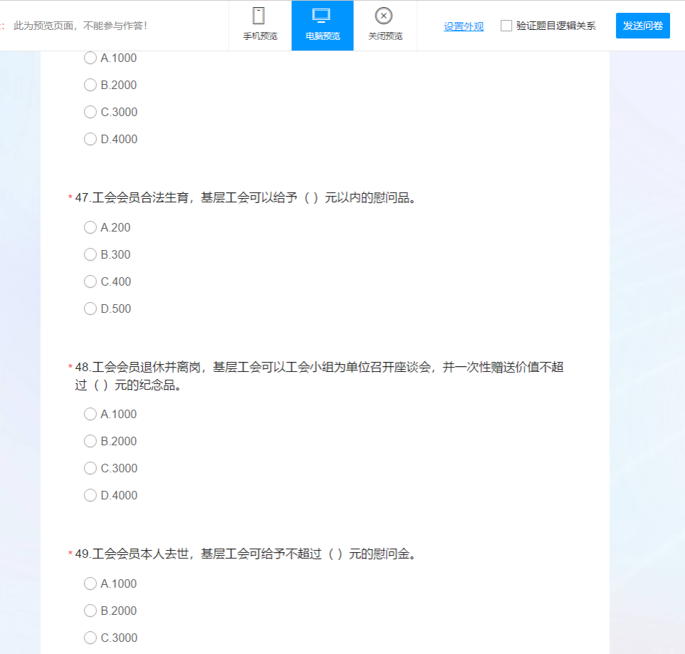 活动采取扫码登录,在线答题的方式进行。考试试卷总计50道题,内容涵盖中国传统文化,诗词歌赋以及党建、工会工作等方面知识。教师自行选择答题时间,在规定时间内答完并提交答卷。