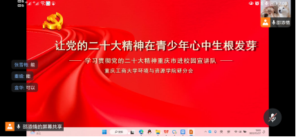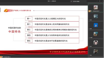 我支部党员、研分会主席邵添情从七个方面深入细致的宣传阐释了二十大会议精神内涵;展示了党的二十大会议主题及主要成果;回顾了中国共产党过去五年的工作内容和中国新时代近十年的伟大变革;论述了马克思主义的中国话时代化;讲述了什么是中国式现代化;阐明了全面建设社会主义现代化国家的目标任务;诠释了要坚持党的全面领导和全面从严治党;提出了青年应当如何应对风险挑战。
