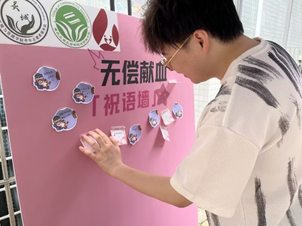 活动期间,志愿者热情友善地引导献血的同学们报名,检测血液,为他们送上面包牛奶,保障活动顺利进行。血液中心的医生们从专业角度,仔细判断同学们献血是否合适,献血量的多少,为同学们讲解献血知识,耐心答疑并给献血的同学颁发献血证和小礼品。献血结束,同学们在志愿者的引导下,纷纷在祝语墙上写下自己对急需血液患者的祝福,希望他们能早日康复。同学们陆续加入,以热情与爱心践行着本次活动“献血传大爱,有你更精彩”的主题。