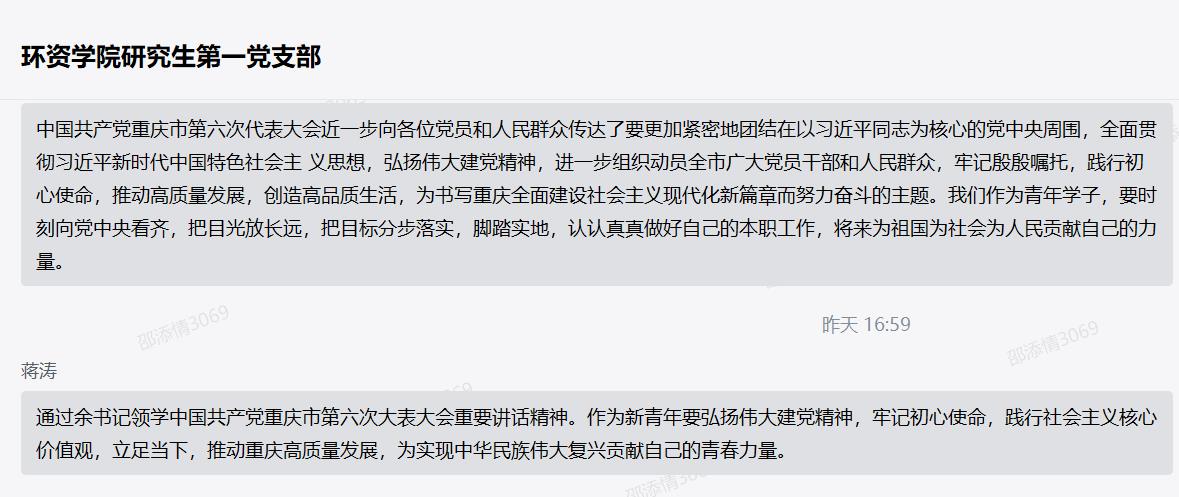 会议结束后,支部党员自学了重庆市第六次党代会的报告,还在企业微信群里分享了学习感想。